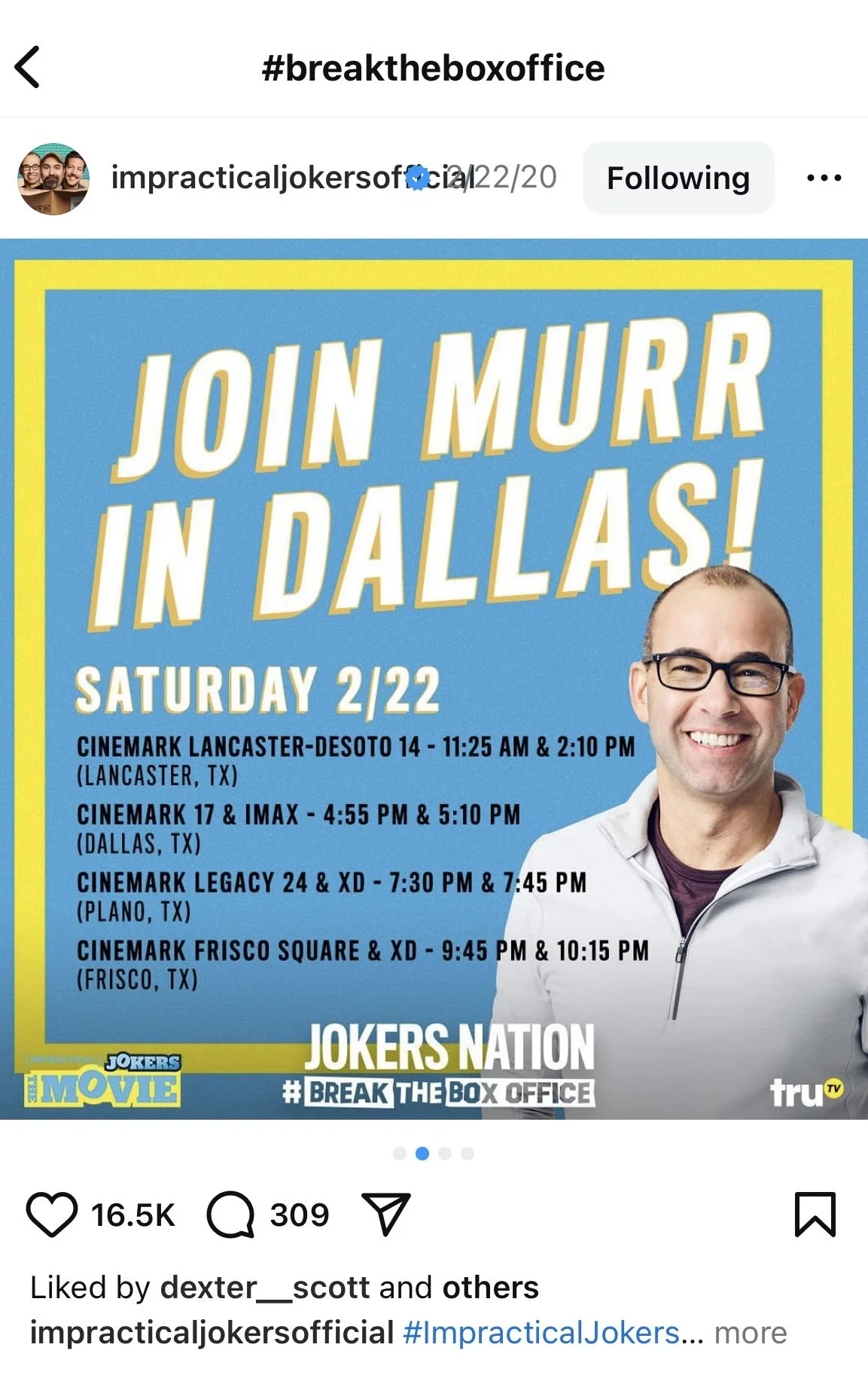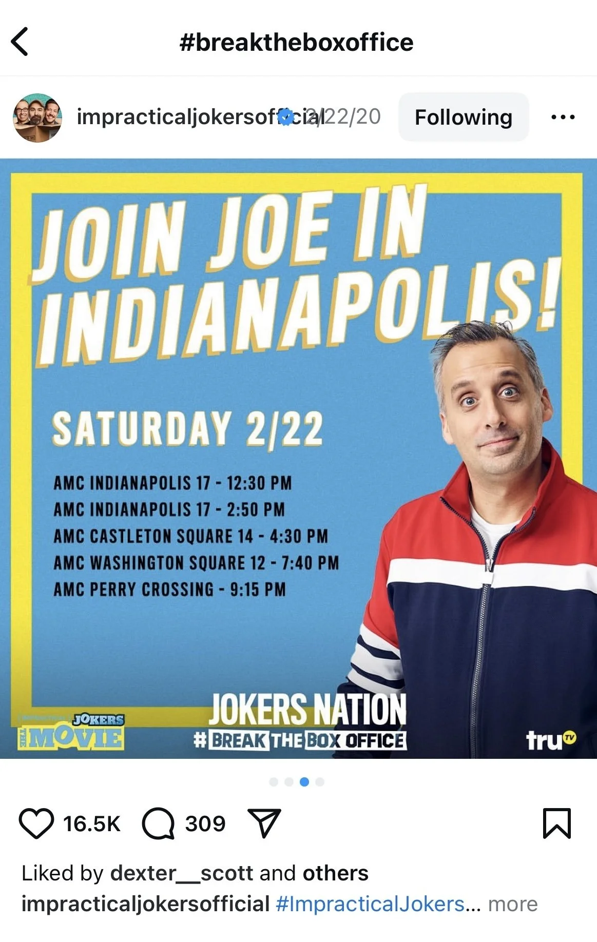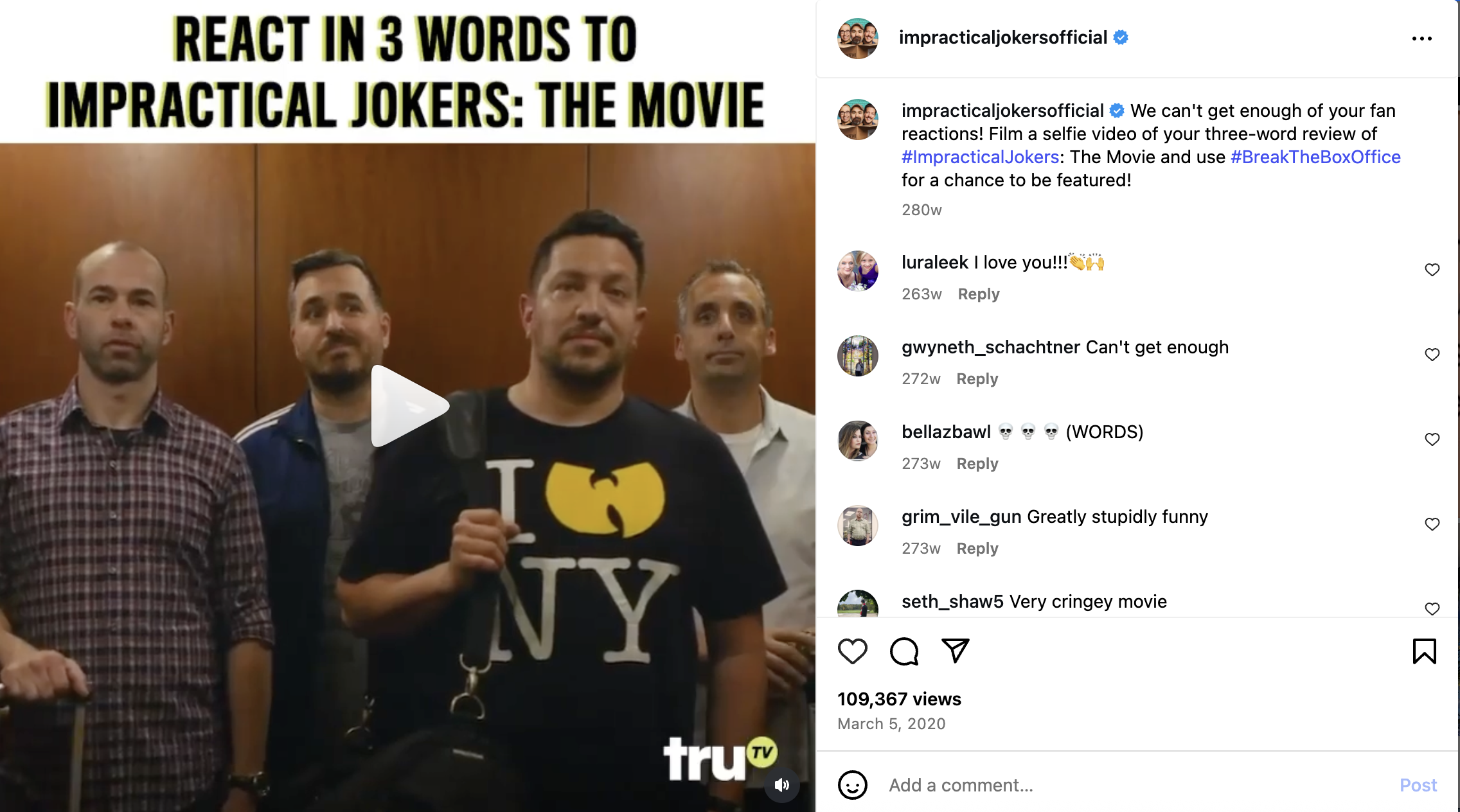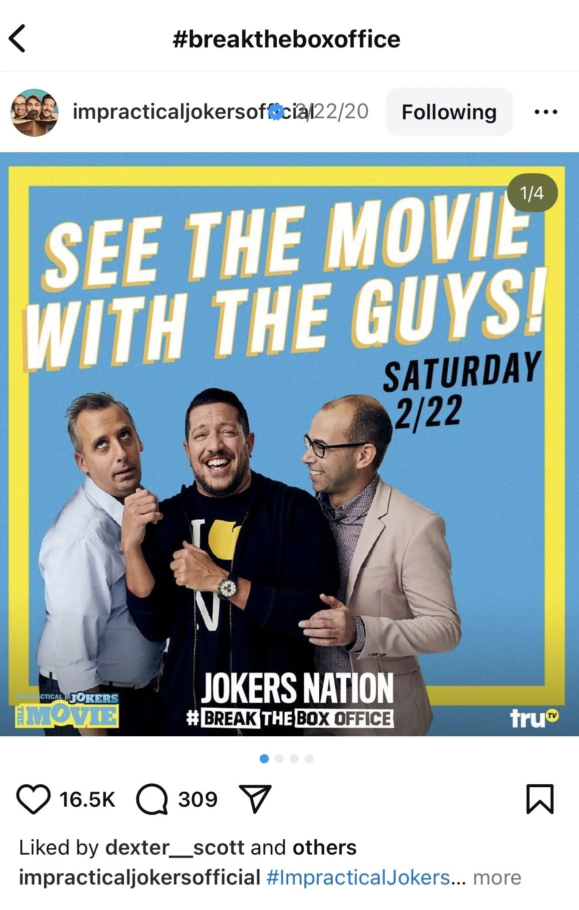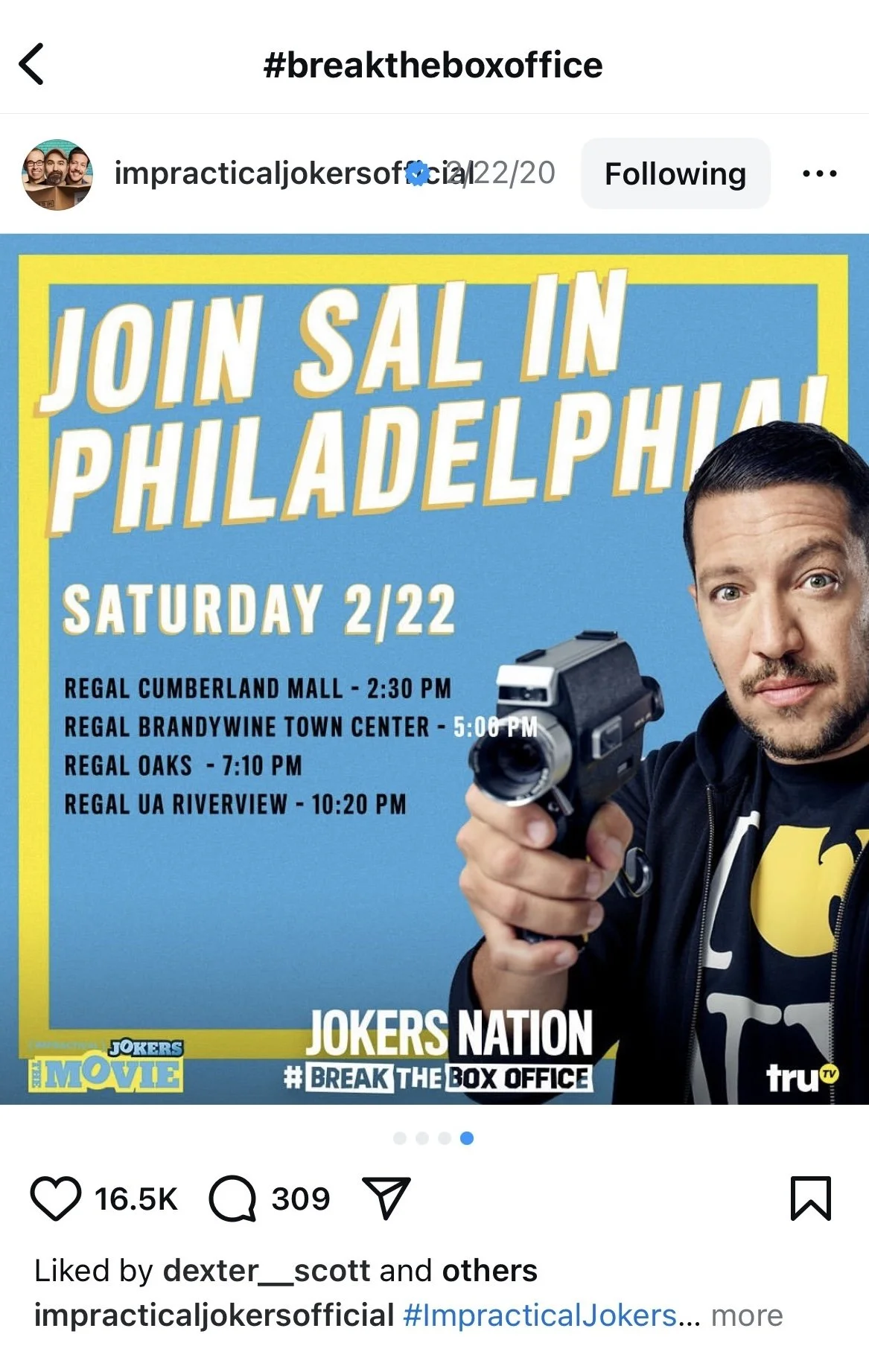 What: We (truTV) paired up with FOD and Movement Strategy to carry out Impractical Jokers: The Movie #BreakTheBoxOffice Campaign for truTV's first-ever self-distributed independent movie release.